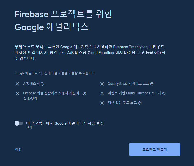 다음은 Google 애널리틱스 설정이다. 선택사항인데, 본 프로젝트에서는 설정하지 않기로 했다.