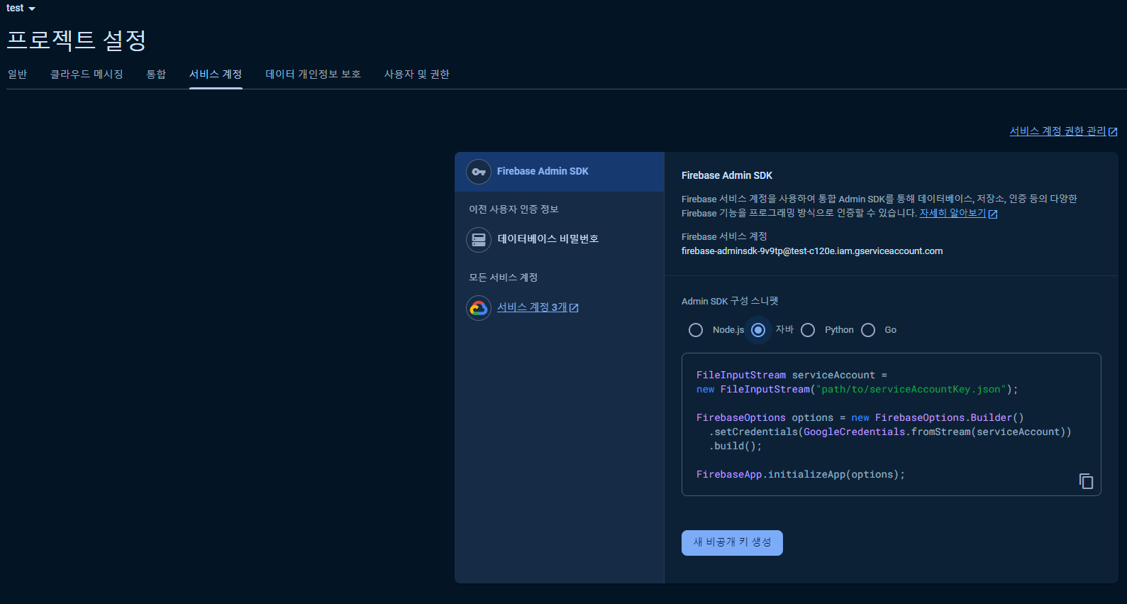 서비스 계정 탭을 클릭하면 계정 키를 발급받을 수 있다. 이 프로젝트는 자바를 사용하므로 이를 발급받는다.
