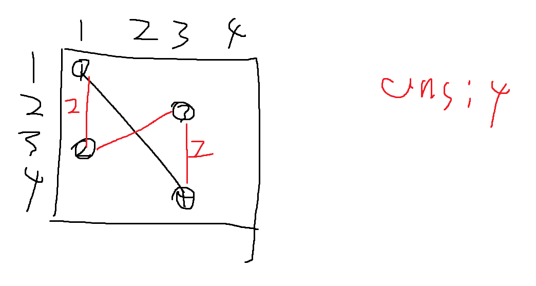(1,1) (3,1) (2,3) (4,3) 이렇게 우주신들과 황선자씨의 좌표가 주어졌고 1번하고 4번이 연결되어 있다. 그렇다면 1번하고 2번을 잇는 통로를 만들고 3번하고 4번을 잇는 통로를 만들면 신들과 선자씨끼