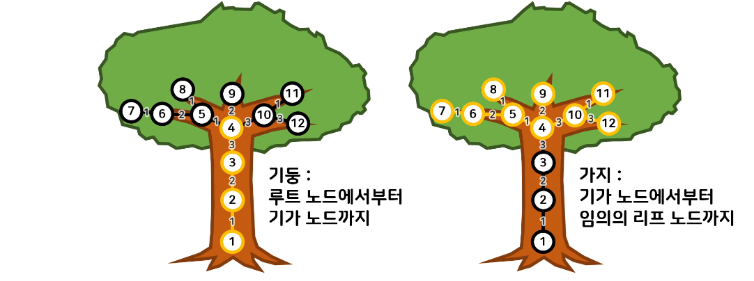 기둥과 가지를 위와 같이 정의할 때, 기둥의 길이와 가장 긴 가지의 길이를 구하라.