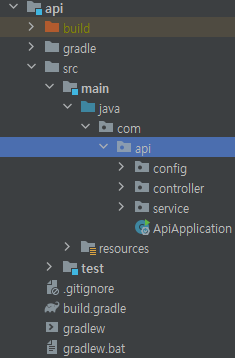 api 모듈의 디렉토리이다. 컨트롤러, 서비스와 컴포넌트 스캔을 위한 config 패키지가 포함되어 있다. 컨트롤러로 사용자의 요청을 직접 받아오므로 메인 애플리케이션은 여기에 존재한다.
