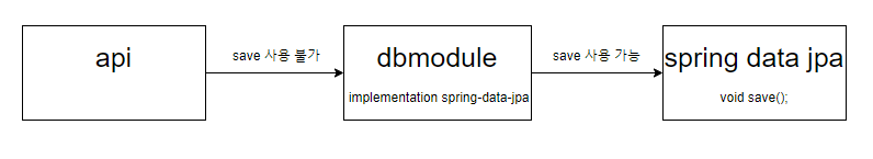 api는 dbmodule을 의존, dbmodule는 스프링데이터 jpa를 의존하고 있다. 이를 transitive dependency라 한다. dbmodule에서 implementation을 사용하면 transitive dependency를 불허하여 api에서 해당 기능을 사용할 수 없다.
