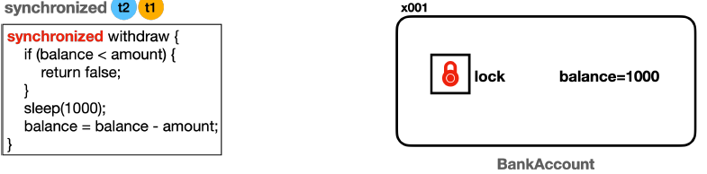 - t1이 withdraw를 실행하고, synchronized 코드에 진입하기 위해 락을 획득 후 진입한다.