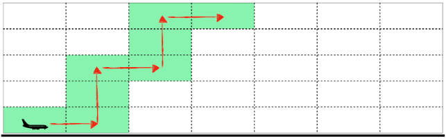 모형 비행기는 맨 왼쪽 아래 칸에서 상승 비행으로 비행을 시작해야 하고, 중간에 상승 비행에서 하강 비행으로 변경한 후, 맨 오른쪽 아래 칸에서 하강 비행으로 비행을 종료해야 한다. 상승 비행에서 하강 비행으로 변경할 때에는 다른 칸으로 이동할 수 없다. 즉, 상승 비행이 끝난 칸에서 하강 비행을 시작해야 한다.