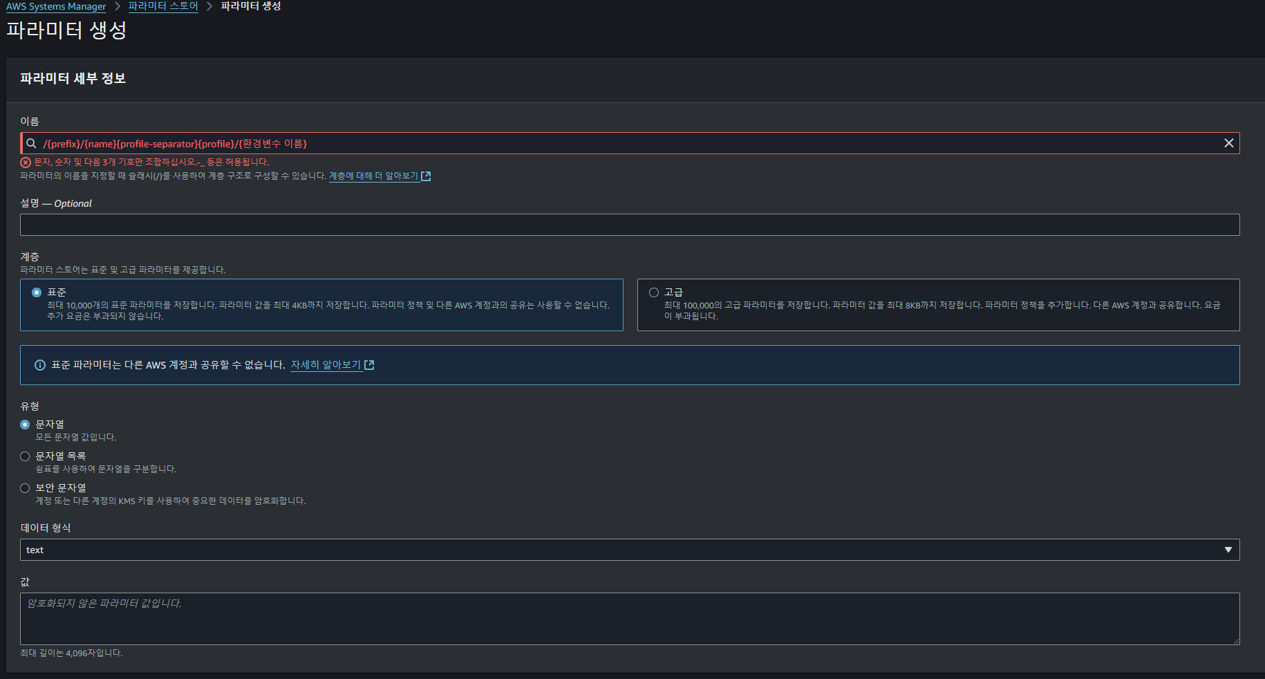 민감 정보라면 유형을 보안 문자열로 설정하여 암호화할 수 있다. 값에 해당 환경변수의 값을 적고 파라미터 생성을 눌러 저장한다.