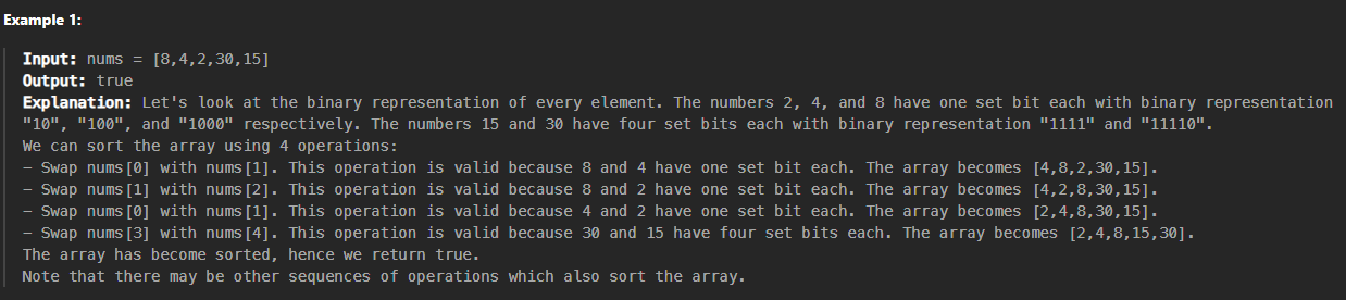 100 이하 길이, 2^8 이하의 자연수가 담긴 nums 배열이 주어진다. 해당 배열을 정렬하려 하는데 배열 내 숫자에서 이진법으로 바꾸었을 때 1의 개수가 같은 수 끼리만 위치를 바꿀 수 있다. 이 때 해당 규칙을 지키며 배열을 정렬할 수 있다면 true, 없다면 false를 반환하라.