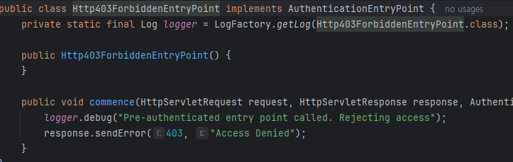 Http403ForbiddenEntryPoint에서 해당 응답을 보내고, 해당 클래스는 AuthenticationEntryPoint를 구현하는 것을 확인하였다. 이에 따라 해당 인터페이스의 구현체를 커스텀해보기로 하자.