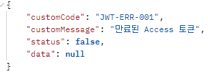 만료된 토큰을 작성하였을 때 직접 만든 커스텀 응답이 정상적으로 보내지는 것을 확인할 수 있었다.
