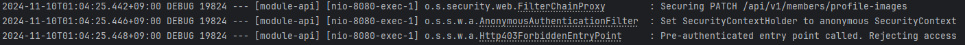 403 오류가 발생하고 아무런 응답도 주어지지 않는데, 이의 발생경로를 확인해보기 위해 로깅 레벨을 debug로 보내고 같은 요청을 해보았다.