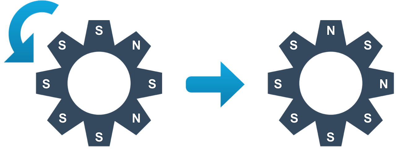 위와 같은 상태에서 1번 톱니바퀴를 시계 방향으로 회전시키면, 2번 톱니바퀴가 반시계 방향으로 회전하게 되고, 2번이 회전하기 때문에, 3번도 동시에 시계 방향으로 회전하게 된다. 4번은 3번이 회전하지만, 맞닿은 극이 같기 때문에 회전하지 않는다. 따라서, 아래와 같은 상태가 된다.