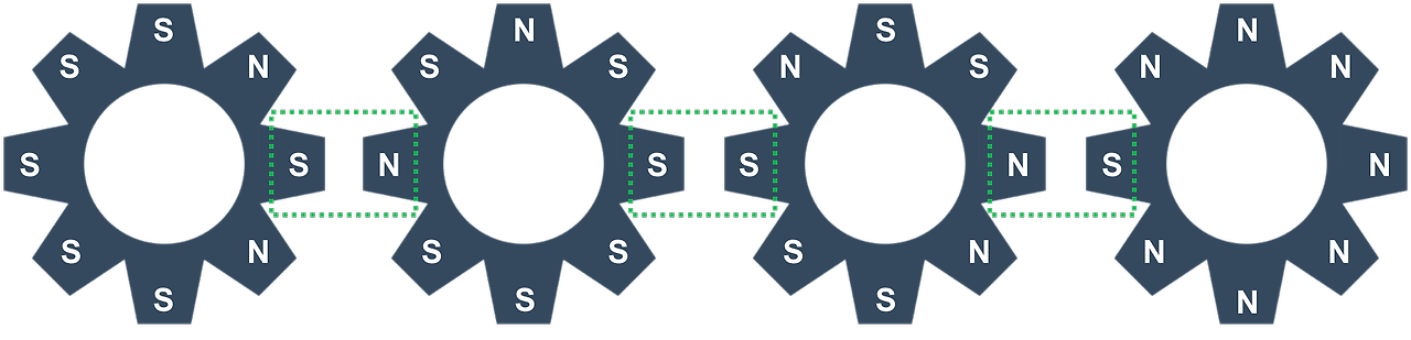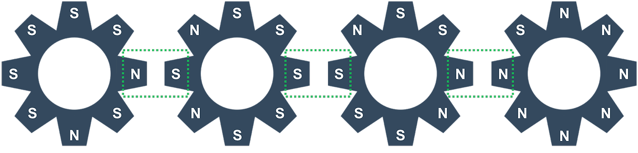 두 톱니바퀴의 맞닿은 부분은 초록색 점선으로 묶여있는 부분이다. 여기서, 3번 톱니바퀴를 반시계 방향으로 회전했다면, 4번 톱니바퀴는 시계 방향으로 회전하게 된다. 2번 톱니바퀴는 맞닿은 부분이 S극으로 서로 같기 때문에, 회전하지 않게 되고, 1번 톱니바퀴는 2번이 회전하지 않았기 때문에, 회전하지 않게 된다. 따라서, 아래 그림과 같은 모양을 만들게 된다.