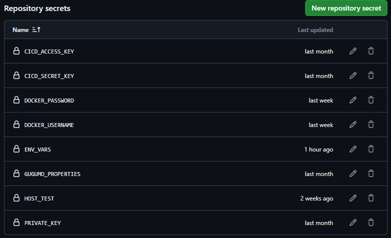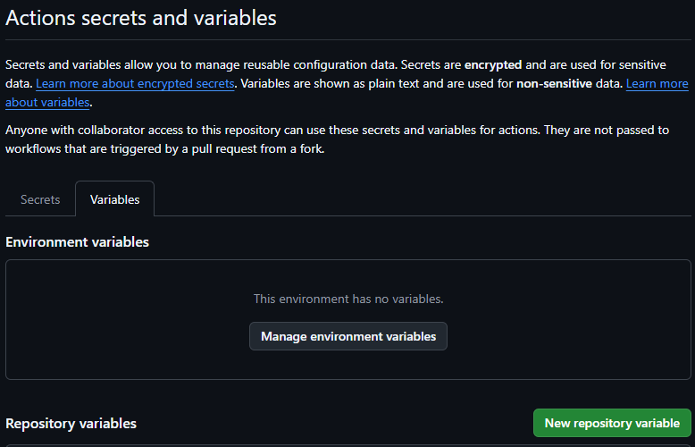 Variables를 선택하여 new repository variable을 누르면 변수를 만들어 저장할 수 있다.