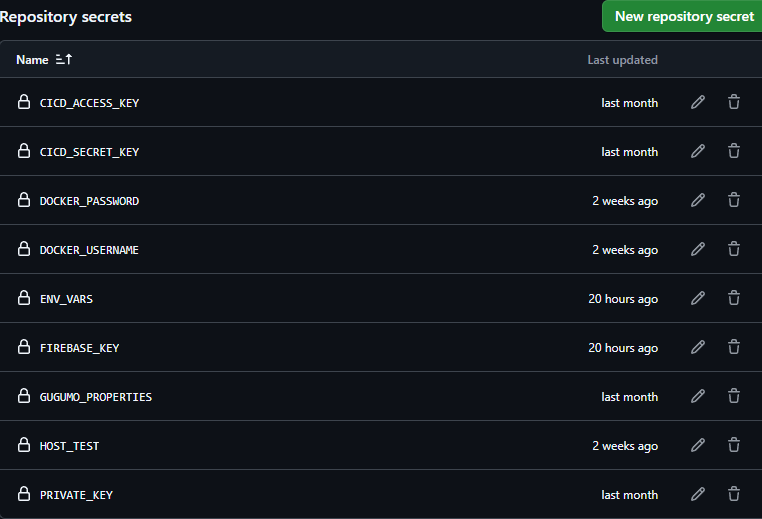 해당 프로젝트에서는 환경 변수를 주입하는 방식으로 민감 정보를 관리한다. 이에 따라 env 파일을 만들어 깃허브에 secrets로 등록하고