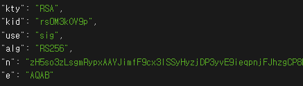 우선 응답 dto이다. List에는 3개의 키가 담겨있고, 토큰의 kid, alg를 넣어 같은 값을 가지는 키를 가져올 수 있다.