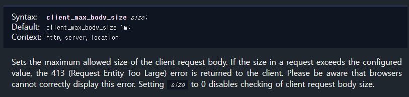 nginx 공식 문서의 일부이다. body 크기는 따로 지정하지 않으면 1MB가 최대이다. 서버는 장당 최대 5MB를 수용할 수 있으니 일종의 병목으로 인한 오류가 발생한 것이다.