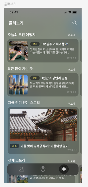 이후 본인이 작성한 글, 추천 여행지, 최근 많이 간 곳 등 스토리의 리스트가 주어진다.