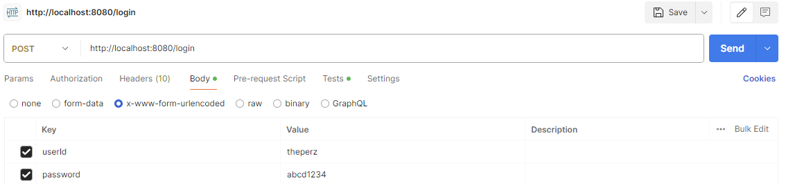 - 테스트를 위해 임시 데이터를 추가(userId: theperz, password: abcd1234)