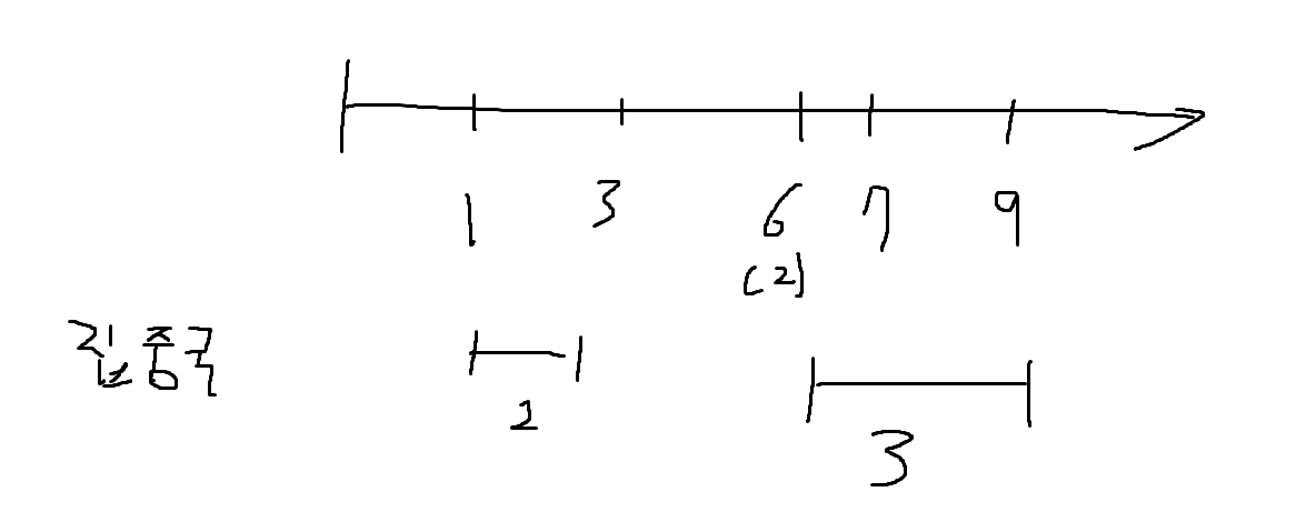 - 센서 사이의 공간을 큰 것부터 k-1개를 제외한다. 그렇게 되면 k개의 집중국이 되고, 가장 큰 길이가 제거되므로 집중국의 수신 가능 거리는 최소가 된다.