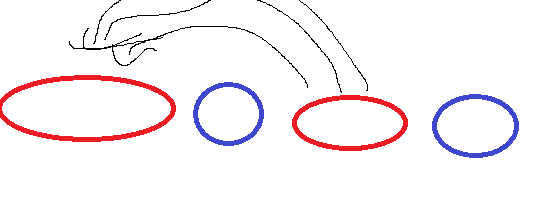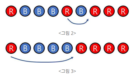 빨간 볼과 파란 볼의 일직선 상의 위치가 주어진다. 이를 다음과 같은 규칙으로 옮겨 같은 색상의 볼끼리 인접하게 놓이도록 하려고 한다.